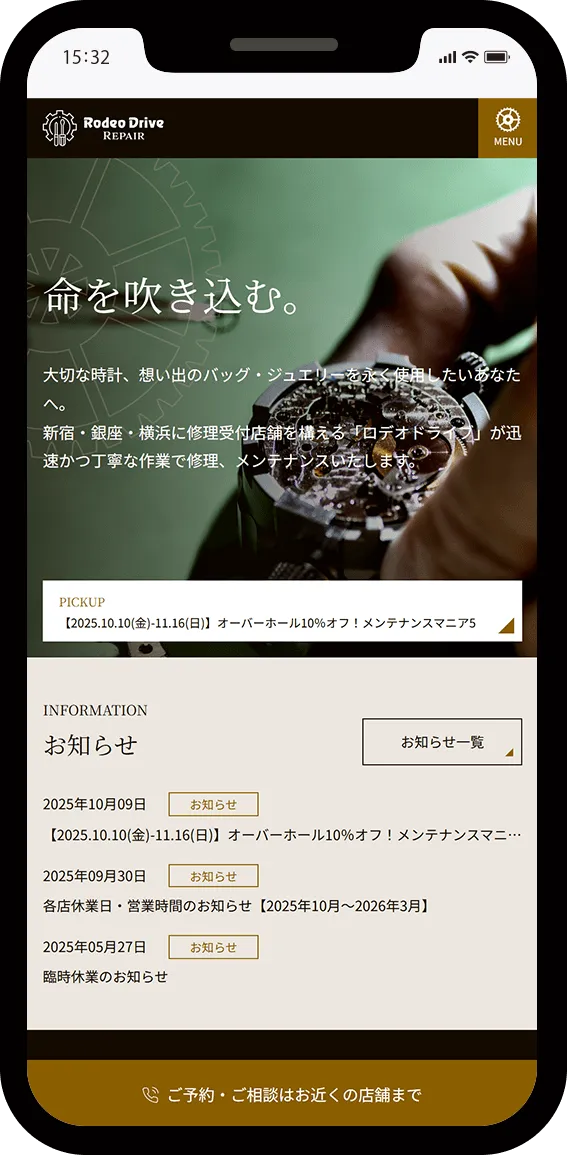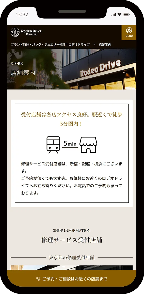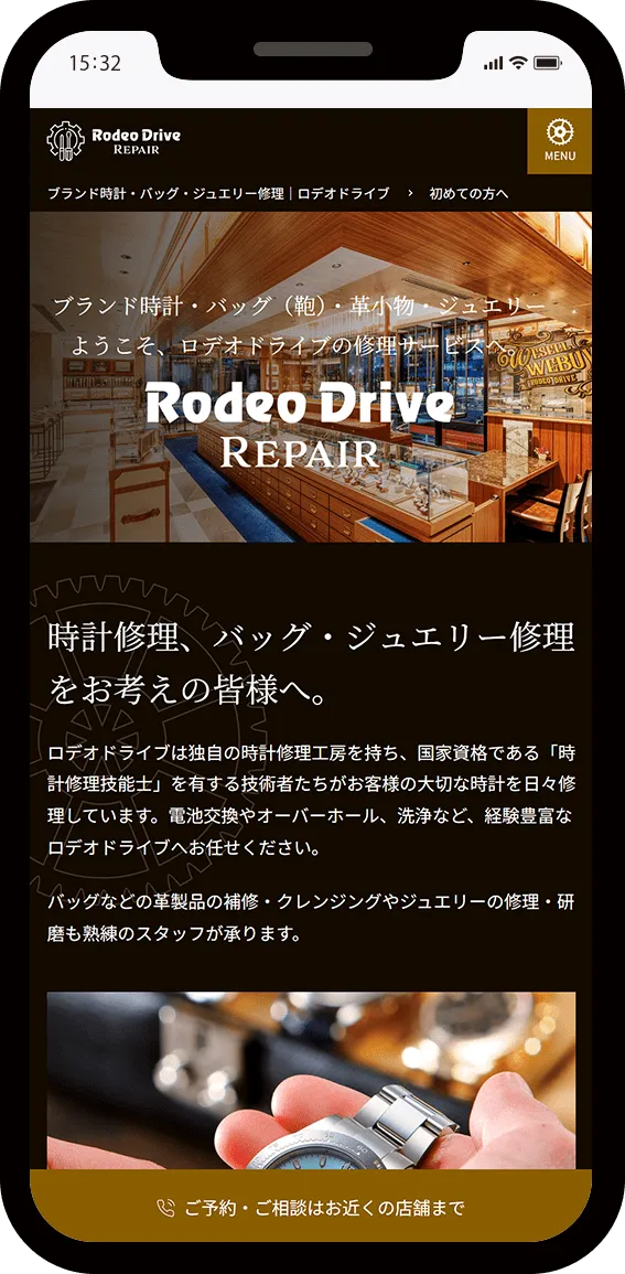 また、修理技術の品質の高さと透明性を伝えるため、実際の修理工程や店舗空間を捉えた高品質な写真をご提供いただき、効果的に配置することで視覚的な信頼性を高めました。